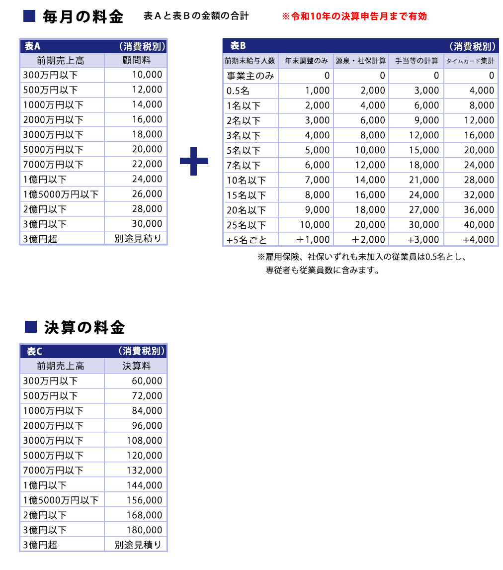 表Aと表Cは、 前年度の売上高によって、 表Bは前年度末の従業員数によって 金額が決まります。